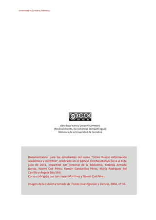 Este documento presenta un manual para un curso sobre cómo buscar información académica y científica. El curso se llevará a cabo del 4 al 8 de julio de 2011 en la Biblioteca de la Universidad de Cantabria y cubrirá temas como diferentes herramientas para buscar información en internet y la biblioteca, cómo encontrar y usar diferentes tipos de documentos, y cómo mejorar las técnicas de búsqueda y presentar información. El manual contiene cinco capítulos y tres apéndices sobre estos temas.