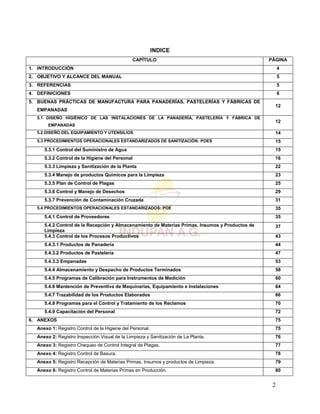 Este manual presenta las buenas prácticas de manufactura aplicadas a panaderías, pastelerías y fábricas de empanadas. Describe los procedimientos operacionales estándar relacionados con la higiene del personal, limpieza e instalaciones, control de plagas, recepción de materias primas y procesos productivos. Incluye anexos con formatos de registros para controlar las diferentes etapas de producción y asegurar la inocuidad de los alimentos elaborados. El objetivo es entregar una guía práctica que permita a las