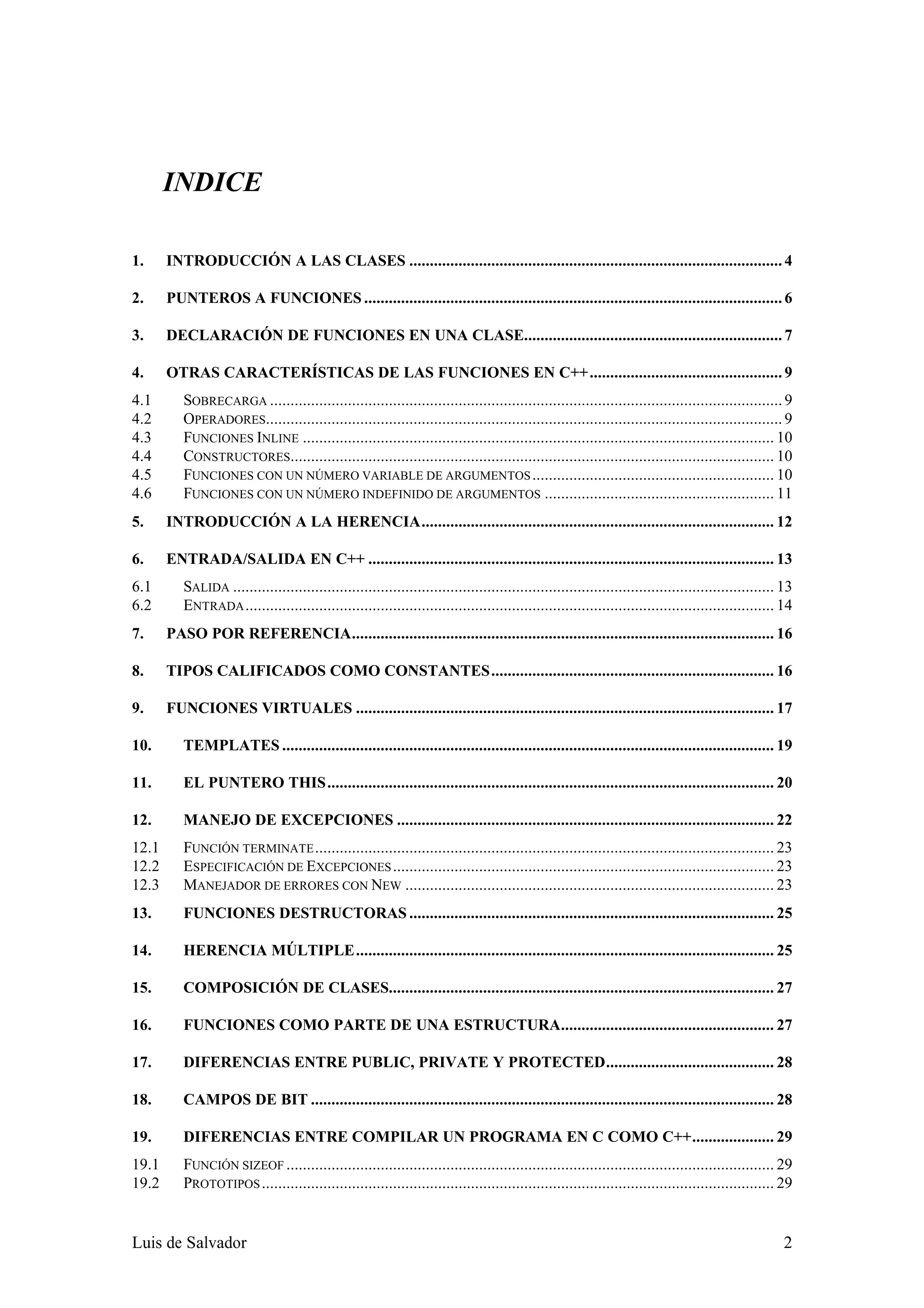 Este documento presenta un curso introductorio sobre C++ para programadores en C. Cubre temas como clases, punteros a funciones, declaración de funciones en clases, sobrecarga de funciones, funciones inline, constructores, funciones con número variable de argumentos, herencia, entrada/salida, paso por referencia, constantes, funciones virtuales, templates, puntero this, manejo de excepciones, funciones destructoras, herencia múltiple, composición de clases, funciones como parte de una estructura y las diferencias entre public, private y protected. También incl