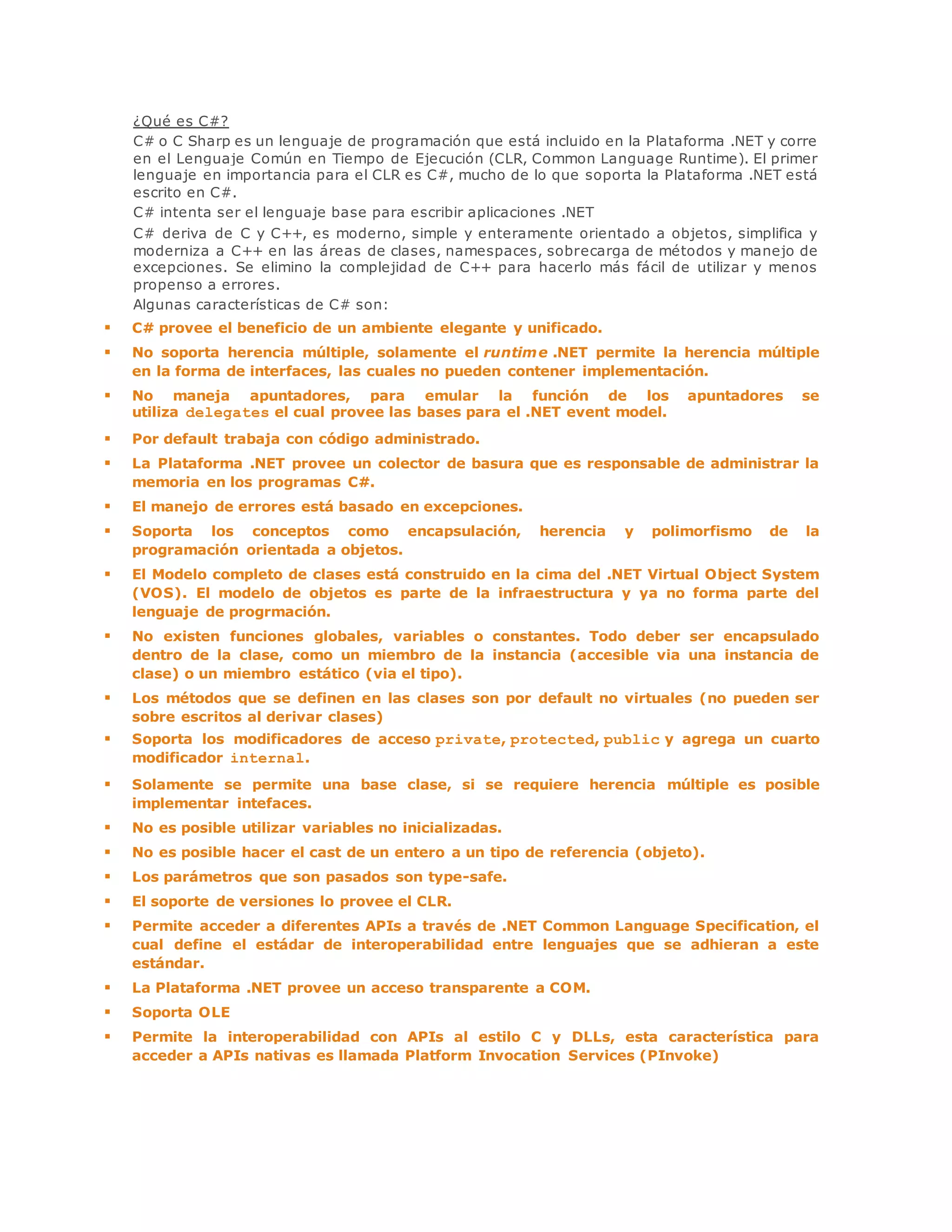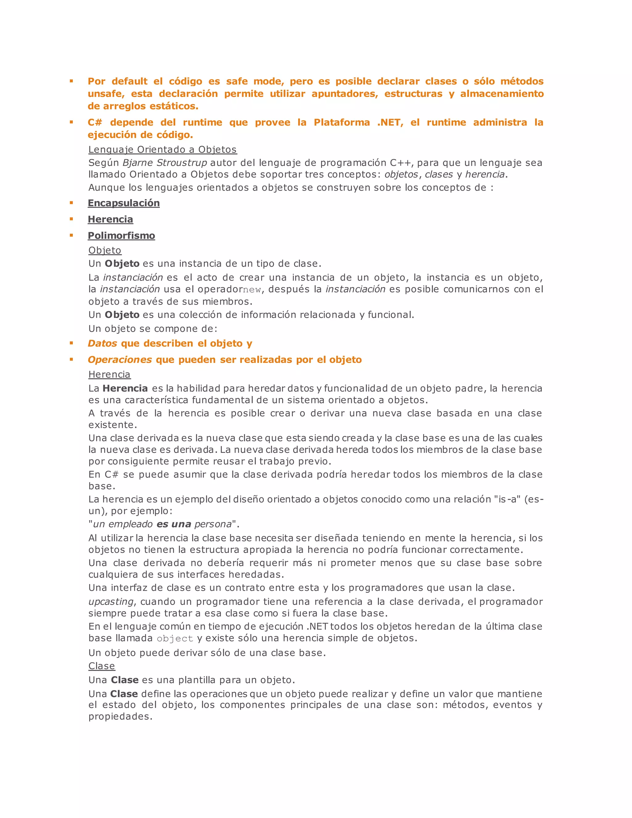 C# es un lenguaje de programación orientado a objetos diseñado para la Plataforma .NET. C# deriva de C y C++ pero simplifica conceptos como clases, herencia y excepciones. Los programas en C# se compilan a código administrado que es ejecutado por la Máquina Virtual de .NET, la cual administra recursos como memoria. C# soporta conceptos clave de la programación orientada a objetos como encapsulación, herencia y polimorfismo.