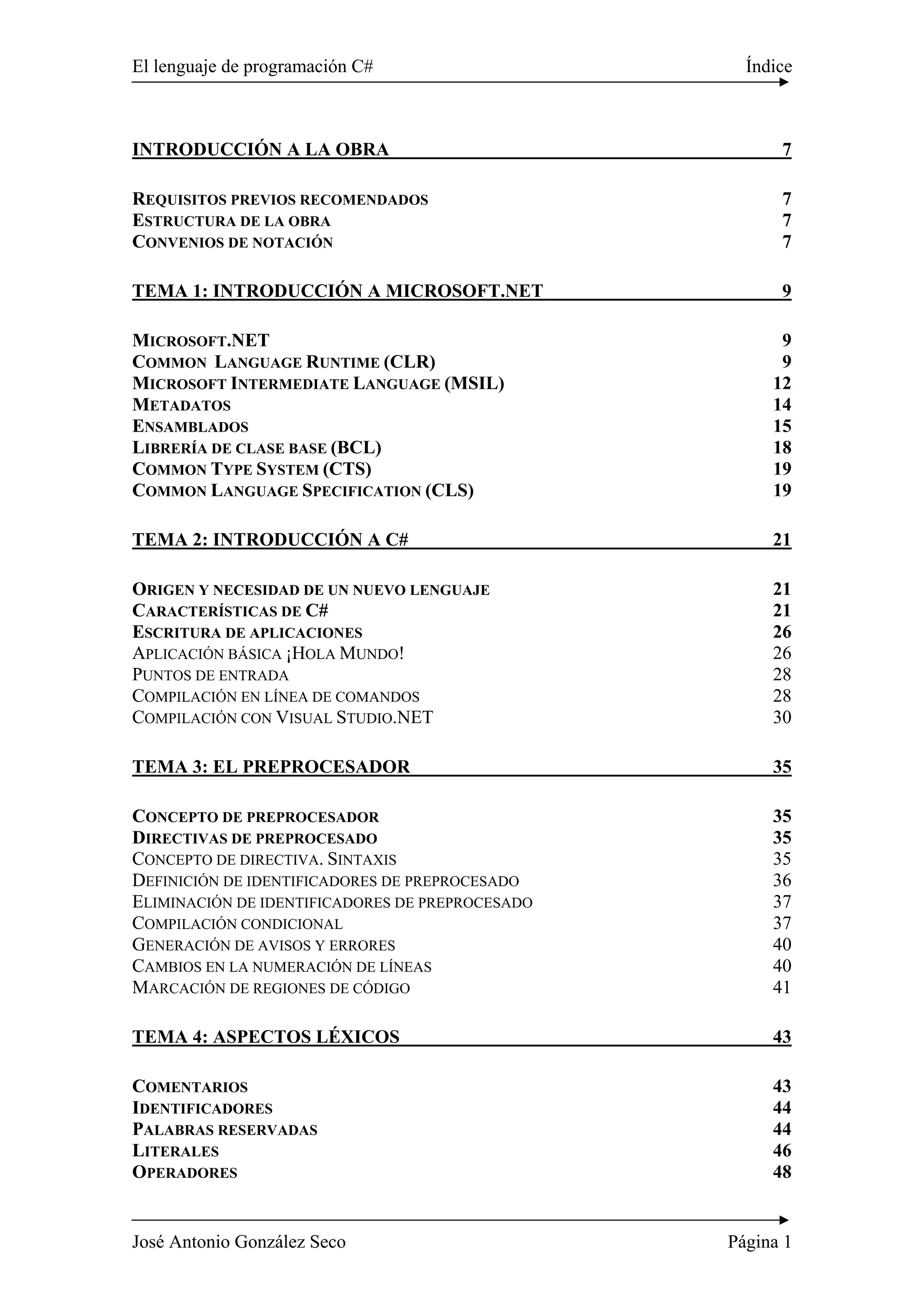 Este documento presenta una introducción al lenguaje de programación C#. Se divide en 20 temas que cubren la introducción a .NET, las características de C#, la descripción detallada de la sintaxis del lenguaje y las opciones del compilador de C#. El objetivo es explicar tanto las funcionalidades de C# como los conceptos subyacentes de .NET de una forma fácil de entender.