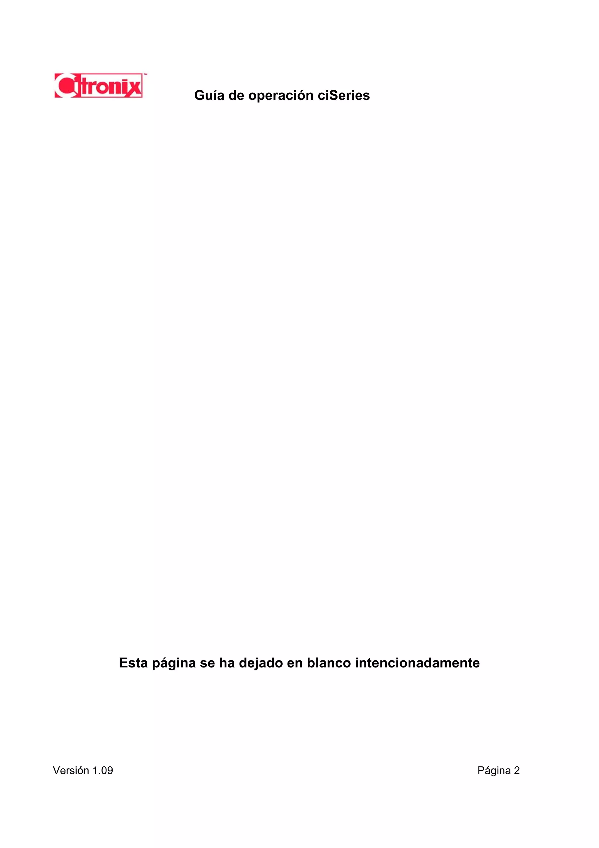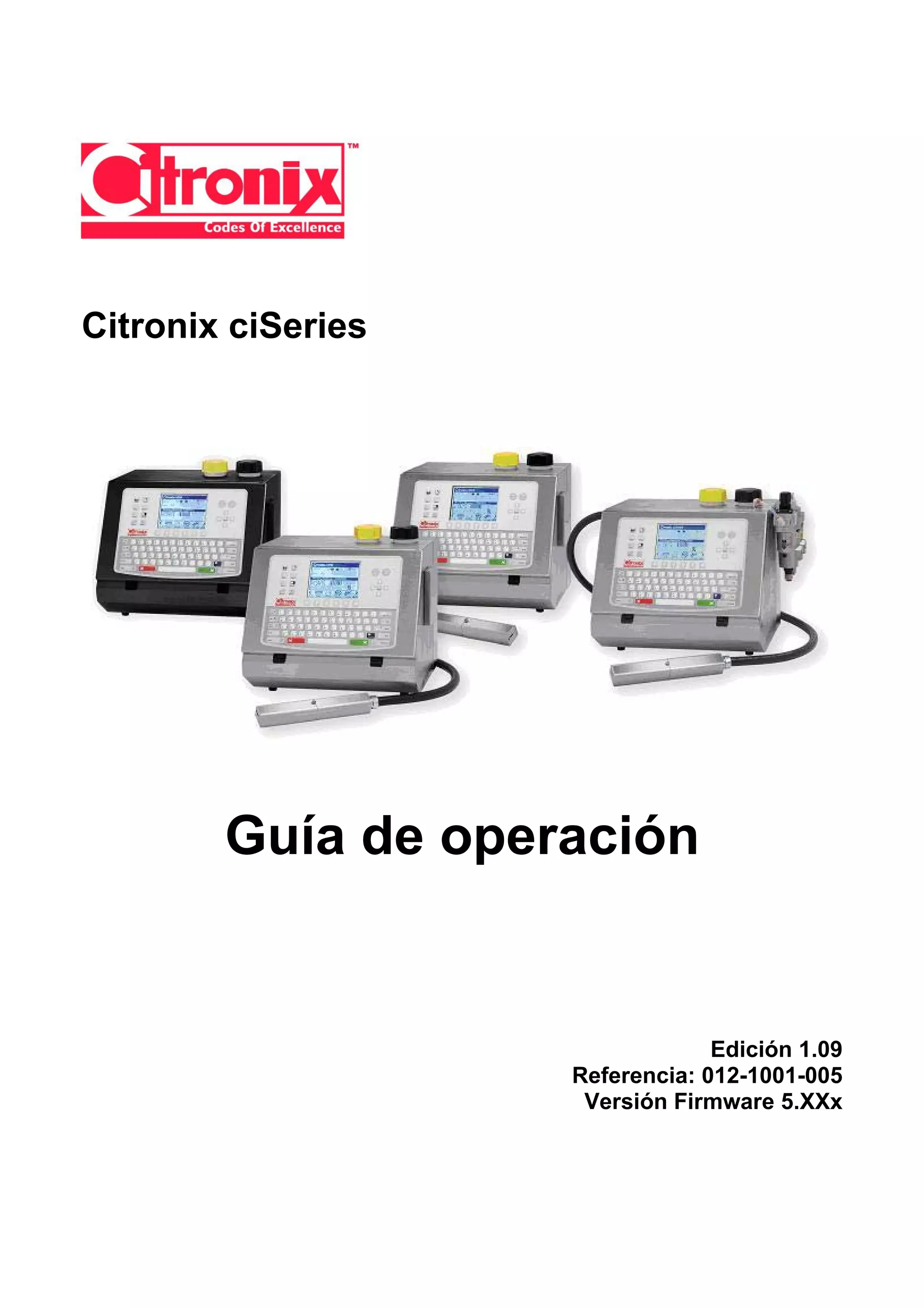 Este documento proporciona instrucciones para operar un sistema de impresión por chorro continuo de tinta Citronix ciSeries. Explica los componentes básicos, cómo encender y apagar el sistema, seleccionar mensajes para imprimir, ajustar la impresión, agregar tinta y realizar limpieza y mantenimiento. También incluye tablas de contenido, referencias de modelos y números de serie, y procedimientos para resolver problemas.