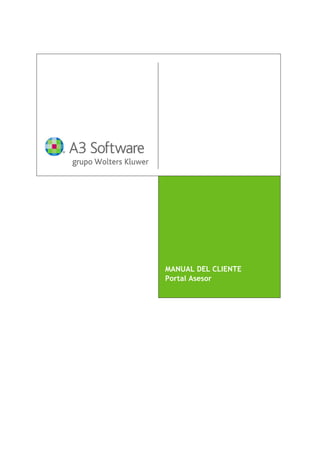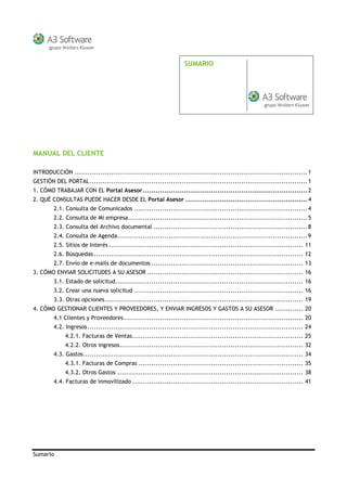 Este manual describe el uso del Portal Asesor, que permite a los clientes comunicarse con su asesor de forma remota. Los clientes pueden enviar solicitudes, consultar comunicados del asesor, ver datos de la empresa como trabajadores e ingresos/gastos, y acceder a documentos archivados como informes. El portal ofrece funciones como gestión de clientes/proveedores, envío de facturas y solicitudes, y búsqueda en documentación.