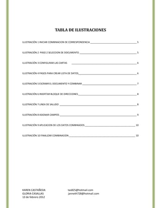 Este manual describe el proceso de combinación de correspondencia para crear múltiples documentos personalizados a partir de un documento maestro y una base de datos de destinatarios. Los pasos incluyen la creación de un documento principal, la selección de una lista de destinatarios existente o la creación de una nueva, la adición de marcadores de posición al documento principal y la generación de copias personalizadas del documento. El manual también explica cómo aplicar formato a los datos combinados y obtener una vista previa antes de la impresión final.