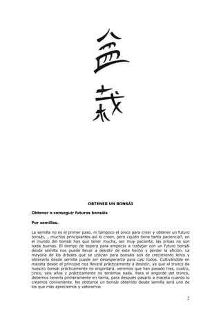 Este documento proporciona información sobre el bonsái, incluyendo su origen en China hace más de 2000 años, y diferentes métodos para obtener futuros bonsáis como semillas, esquejes, injertos, acodo y en viveros. También describe especies caducifolias comunes para bonsái como abedules, almeces, arces y fresnos, y ofrece consejos sobre riego, poda, abonado y trasplante para estas especies.