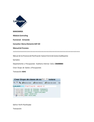 El documento describe los pasos del proceso de planificación de costos hasta el cierre de costos (subreparto) para un departamento, incluyendo la creación de un grupo de gastos, la definición de un perfil de planificador, la aplicación de gastos reales a cuentas mayores, el cierre de costos, informes y el subreparto. Se muestran pantallas completas del proceso de subreparto con la visualización de ciclos, cabecera de segmento, emisor-receptor, valores emisores y factores ponderados