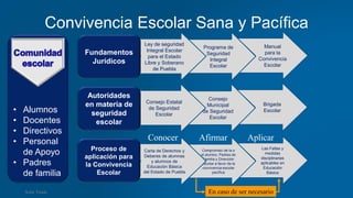El manual presenta las directrices para promover una convivencia escolar sana y pacífica en las escuelas del estado de Puebla. Describe las autoridades y grupos involucrados en la seguridad escolar, incluyendo brigadas escolares, consejos de seguridad a nivel municipal y estatal. También presenta los derechos, deberes y conductas esperadas de los estudiantes, así como las faltas y medidas disciplinarias aplicables según el nivel educativo. El objetivo general es establecer una cultura de paz, respeto y cooperación entre toda la
