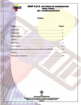 El documento presenta una guía para la conformación y funcionamiento del Comité Paritario de Salud Ocupacional (COPASO) de la empresa SDIP S.A.S. En primer lugar, explica la justificación y objetivo de constituir un COPASO de acuerdo con la ley. Luego, detalla el marco legal y técnico que rige la conformación de este comité, incluyendo su estructura, período de los miembros, funciones y reuniones. Por último, advierte que las empresas que no tengan constituido un COPASO estarán sujetas a