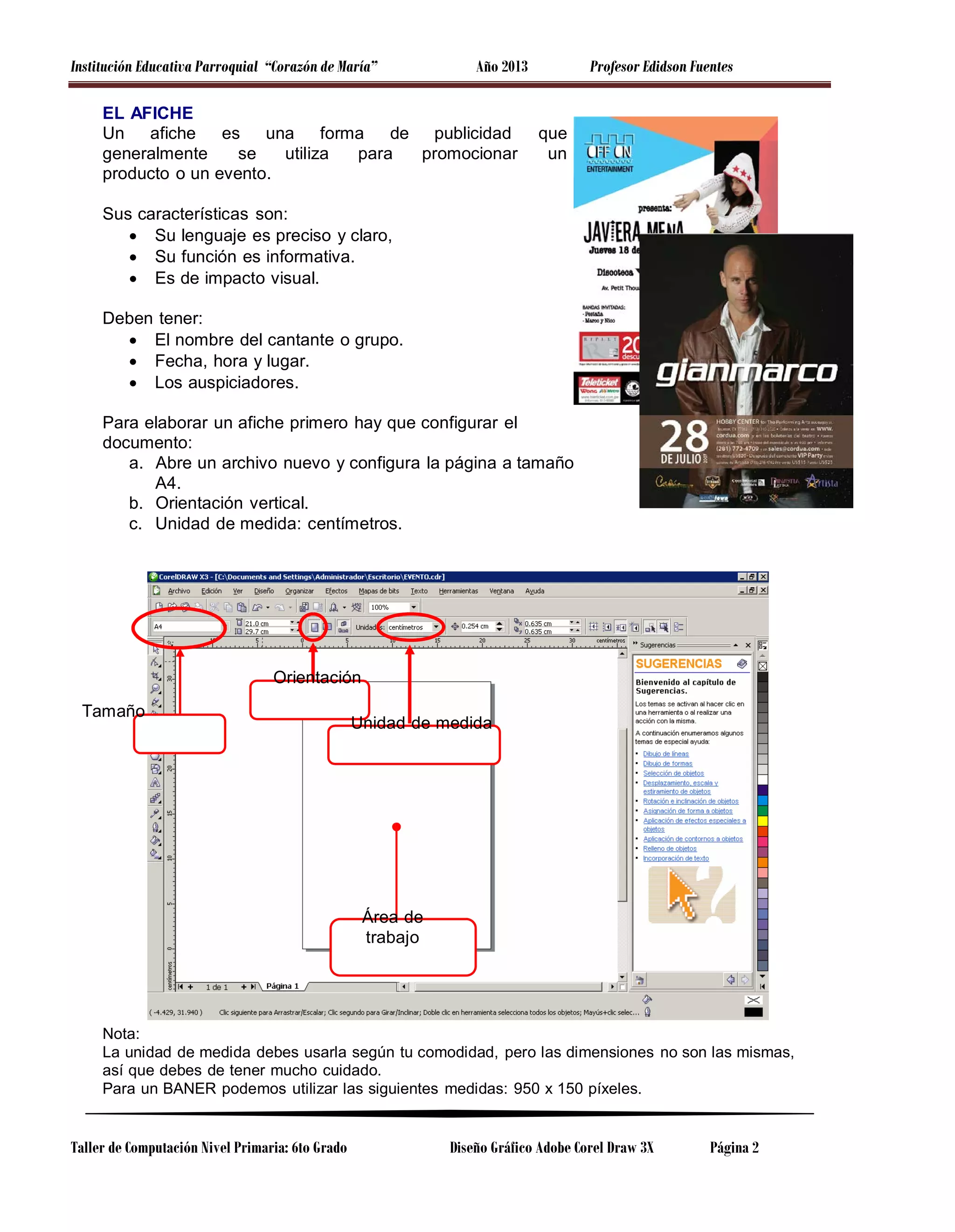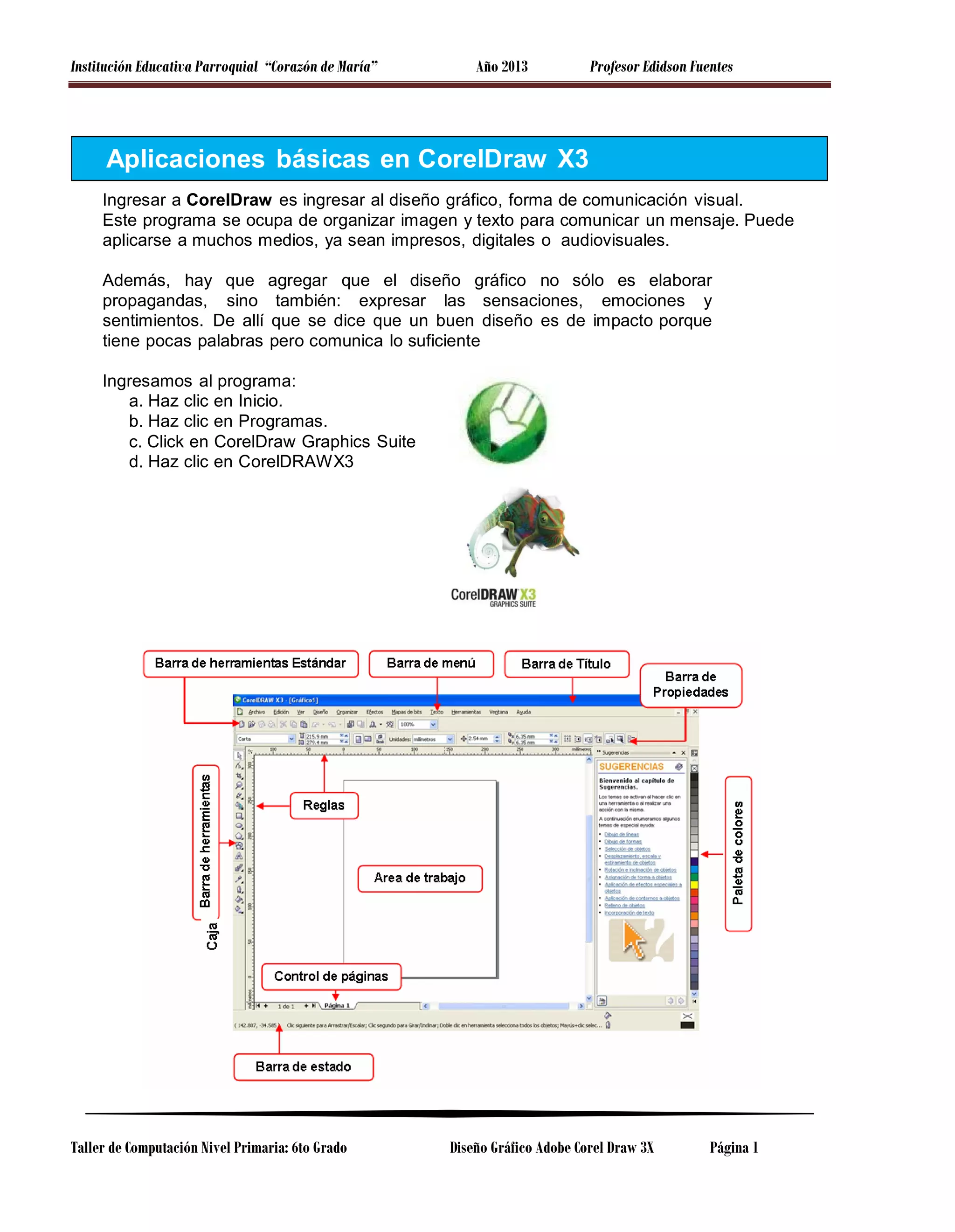 Este documento presenta una guía para aplicaciones básicas en CorelDraw X3. Explica cómo ingresar al programa y realizar tareas como crear un afiche, diseñar logotipos y plantillas utilizando herramientas como rectángulos, curvas, rellenos y sombras. También incluye instrucciones para guardar y salir del programa, así como definiciones de términos como píxeles, formatos de imagen y nodos.