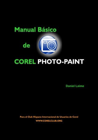 Este manual básico describe la interfaz de usuario de Corel PHOTO-PAINT, incluyendo la caja de herramientas, menús, ventanas acoplables, barras de estado, y opciones de configuración. Explica cómo usar las herramientas de zoom y desplazamiento, líneas guía, cuadrícula y encaje para lograr precisión al trabajar con imágenes. También cubre temas como modos de color, resolución, y gestión del color.