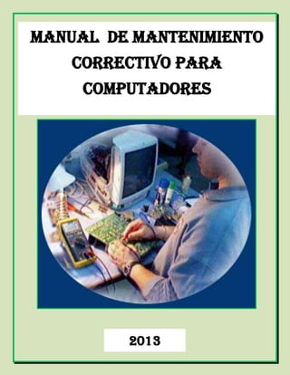 Este documento presenta información sobre el mantenimiento correctivo de computadoras. Explica que este tipo de mantenimiento involucra reparar o reemplazar componentes cuando ocurre un fallo. Describe los tipos de mantenimiento correctivo, posibles daños comunes, ventajas y desventajas, y actividades que se realizan como parte de este proceso como formatear discos duros, eliminar virus, e instalar software.
