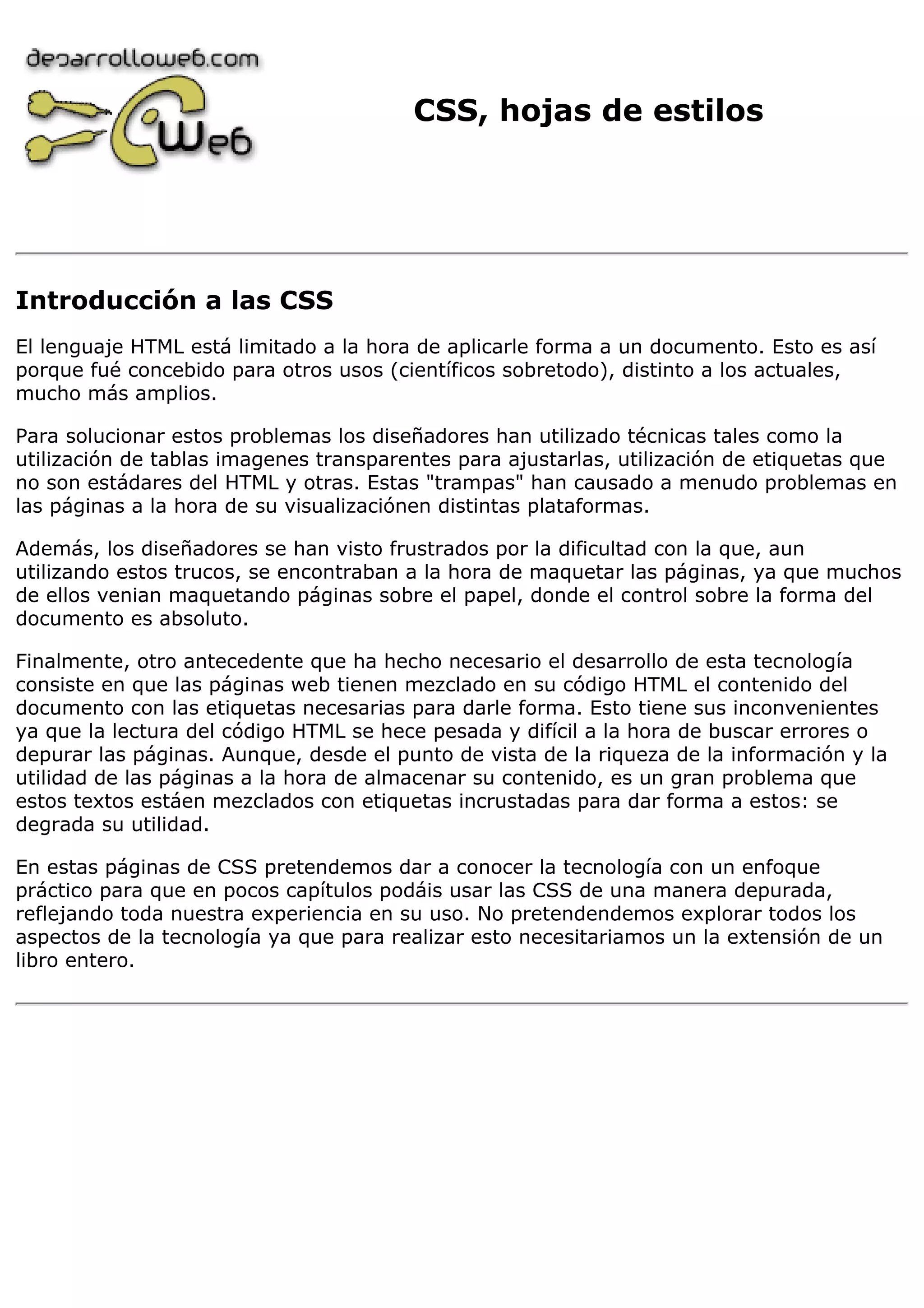 El documento introduce las hojas de estilos en cascada (CSS) y describe sus características y ventajas. CSS permite definir la presentación de todo un sitio web, una página o parte de ella mediante una sintaxis especial. Esto ofrece más control sobre el formato y soluciona problemas del HTML para dar forma a documentos. Los navegadores más recientes soportan CSS, pero se debe usar con cuidado para asegurar la visualización correcta en todos los navegadores.