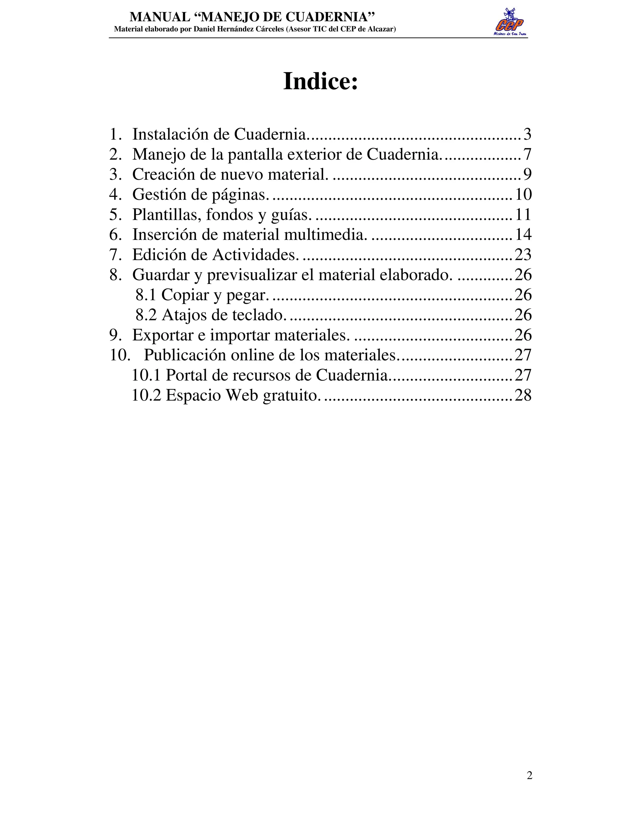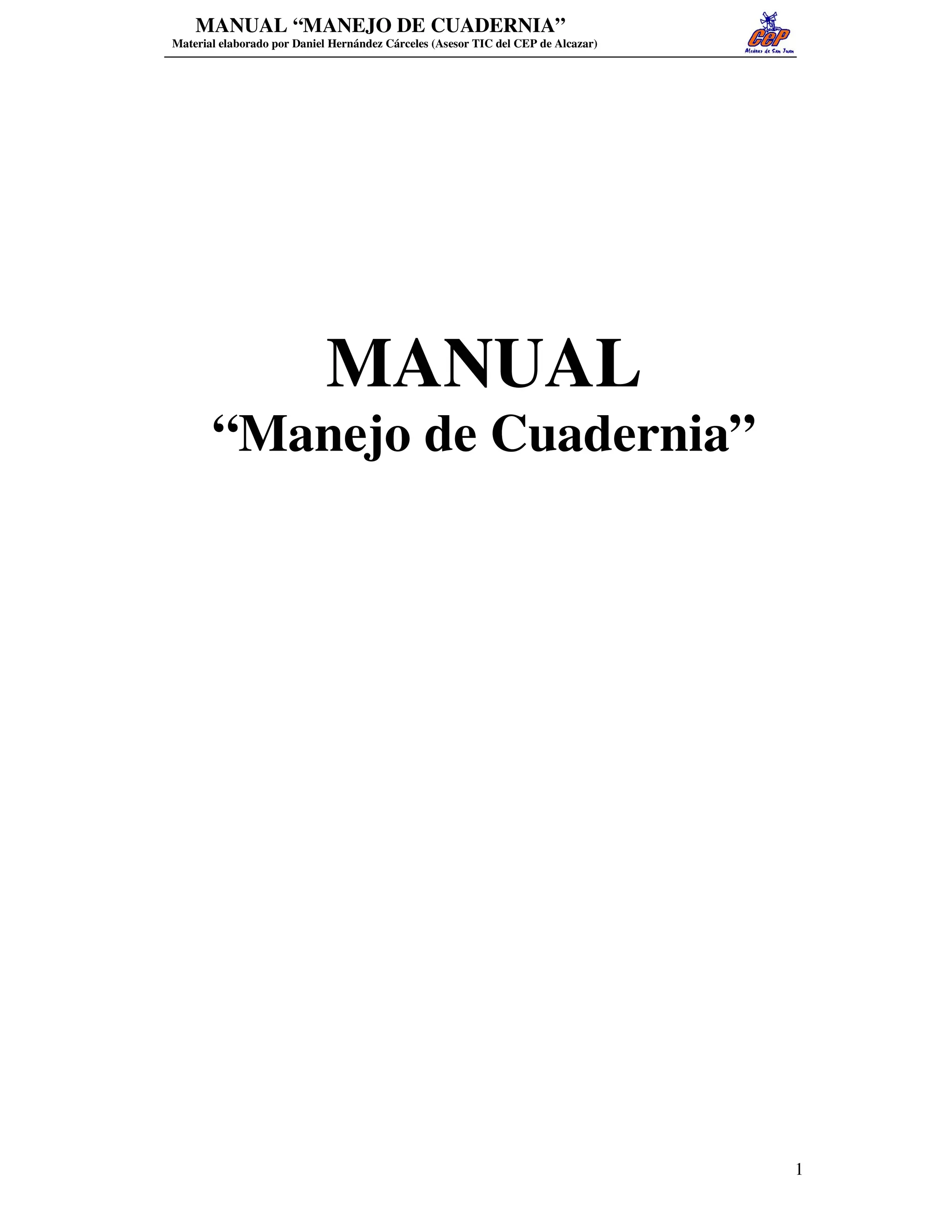 Este documento presenta un manual para el manejo de la aplicación Cuadernia. Explica cómo instalar Cuadernia, gestionar páginas y hojas, utilizar plantillas, fondos y guías, e insertar diferentes tipos de contenido multimedia como imágenes y texto. También cubre cómo guardar, previsualizar y publicar materiales creados en Cuadernia.