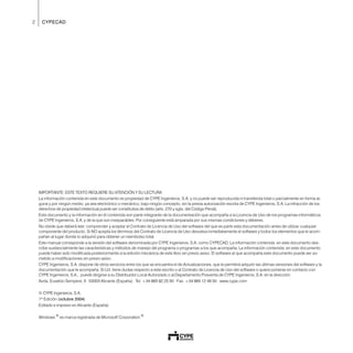 Este documento presenta el manual de usuario del software CYPECAD para ingeniería y construcción. Explica los diferentes menús y opciones de ayuda disponibles en el programa, como la tecla F1 y el icono de interrogación. También describe el esquema general para la introducción y cálculo de estructuras, incluyendo la organización de datos, introducción de elementos, cálculo, revisión y salida de planos. Por último, detalla conceptos sobre la aplicación de forjados inclinados y presenta un ejemplo práctico de uso del programa para el cálculo de una
