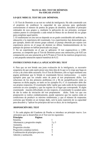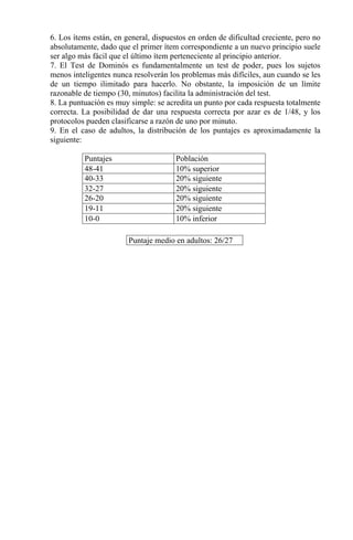Este documento presenta un manual sobre el Test de Dominós, un test no verbal de inteligencia. Explica que el test mide la capacidad de aprehender patrones de puntos en fichas de dominó, descubrir el principio ordenador de los patrones, y aplicar ese principio para completar fichas en blanco. También describe los pasos para administrar el test, incluyendo instrucciones, ejemplos, y un límite de tiempo de 30 minutos. Finalmente, detalla los resultados esperados y la distribución de puntajes en la población.