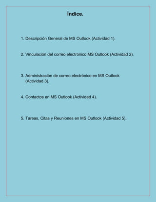 Este documento presenta un manual de uso de Microsoft Outlook. Contiene cinco actividades que describen las características y funciones básicas de Outlook, incluyendo la administración de correo electrónico, contactos, tareas, citas y reuniones. Cada actividad explica paso a paso cómo realizar diferentes tareas comunes en Outlook como vincular cuentas de correo, organizar mensajes, agregar contactos y crear eventos.