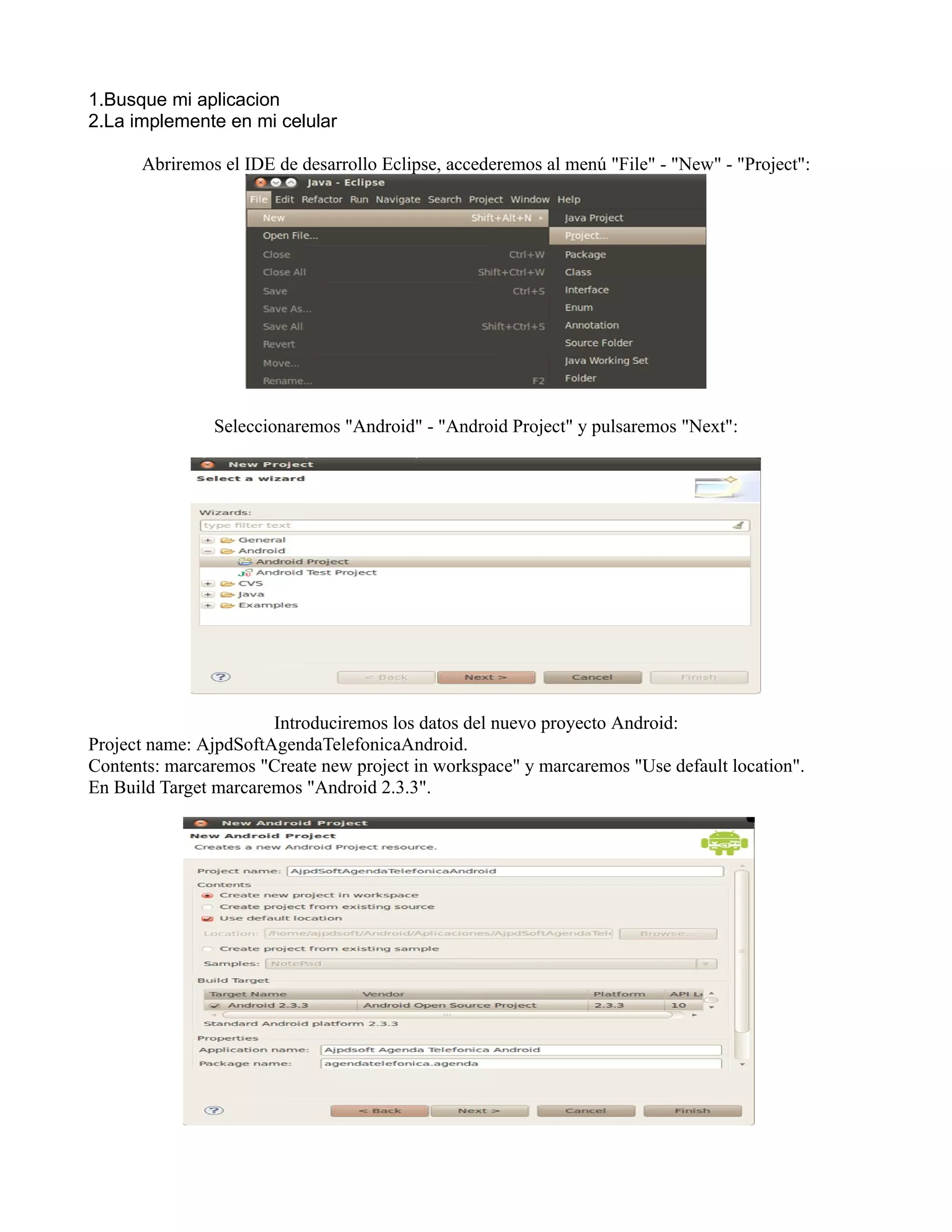 Este documento describe el desarrollo de una aplicación móvil para Android que permite gestionar una agenda de contactos. Explica cómo crear la interfaz gráfica, conectarla a una base de datos SQLite para almacenar los datos e implementar funcionalidad como añadir, eliminar y llamar a contactos.