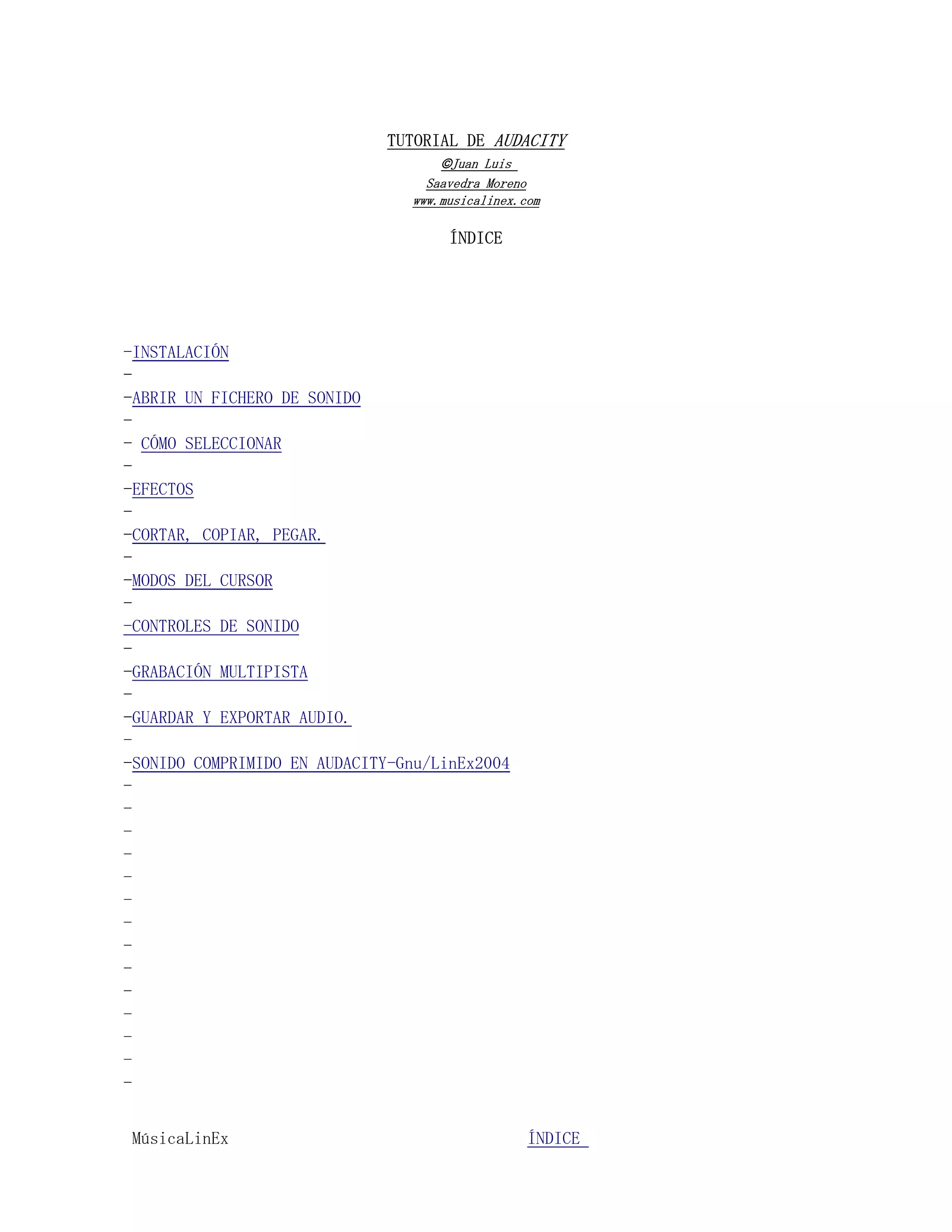 This document provides a tutorial for using the audio editing software Audacity. It discusses installing Audacity in GNU/Linux, opening audio files, selecting regions of audio, applying effects like amplification and echo, cutting, copying and pasting audio, recording multiple tracks, and exporting final audio files in formats like WAV, MP3 or Ogg Vorbis. The tutorial also explains Audacity's interface features such as playback controls, cursor modes for selection and editing, and mixing down multiple tracks into a stereo file.