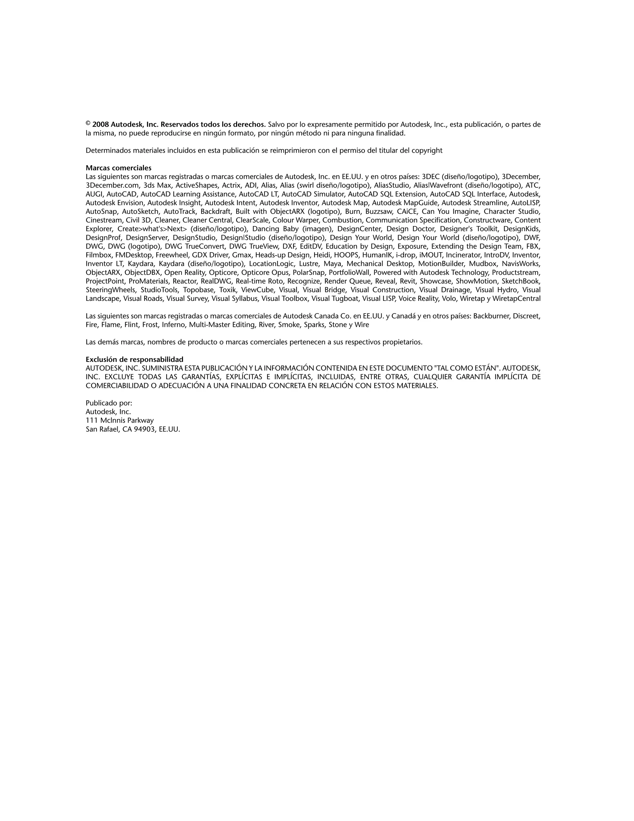 Este manual del usuario describe el software AutoCAD 2009. Incluye instrucciones sobre cómo obtener información de los dibujos, navegar por la interfaz de usuario que incluye la cinta de opciones, menús y otras herramientas, usar la ventana de comandos, herramientas de navegación como ViewCube y SteeringWheels, personalizar la configuración y crear macros de acciones. El manual contiene seis capítulos que cubren estos temas clave del programa AutoCAD.