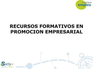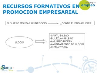 Este documento describe varios recursos formativos para la promoción empresarial en la región de Llodio. Incluye información sobre Sartu Bilbao, Bultz Lan-Bilbao, Amurrio Bidean, el Ayuntamiento de Llodio e INEM, detallando los servicios de asesoramiento y apoyo que cada uno ofrece para emprendedores y nuevas empresas, como asesoramiento para crear un plan de empresa y encontrar subvenciones.