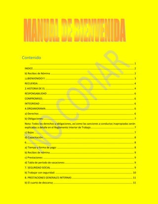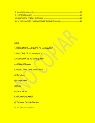 1) El documento presenta la información sobre las políticas, procedimientos y beneficios de la empresa "El Mantequillón" para sus empleados. Incluye secciones sobre la historia de la empresa, derechos y obligaciones de los empleados, pago de nómina, seguridad social, prestaciones y capacitación.