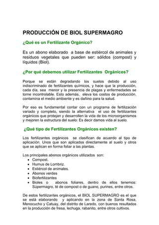 El Biol Supermagro es un fertilizante orgánico líquido y sólido elaborado a partir de estiércol de ganado, agua, leche, melaza y minerales. Contiene nutrientes como nitrógeno, fósforo, potasio, calcio y magnesio. Se aplica a cultivos como hortalizas y frutales en dosis del 1-5% dependiendo del cultivo. Sus principales ventajas son que aporta nutrientes de forma natural y previene enfermedades, mientras que su desventaja es requerir aplicaciones más frec
