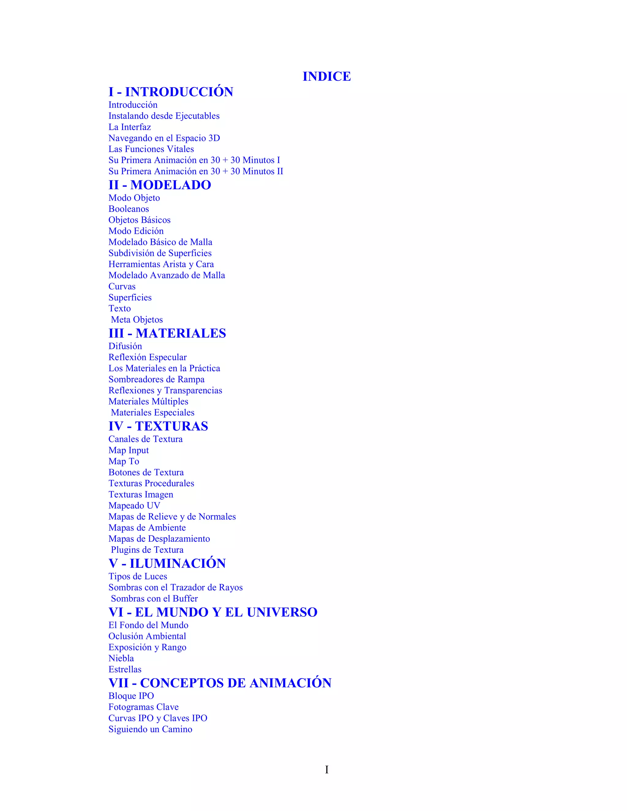 Este documento presenta un índice de los capítulos de una documentación sobre Blender. La primera parte introduce Blender y resume su historia y desarrollo como software libre. El índice lista 15 capítulos que cubren temas como modelado, materiales, texturas, iluminación, animación y renderizado.