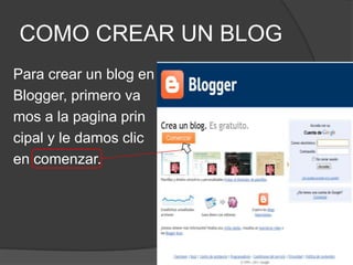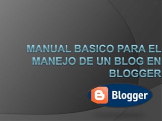 Este documento ofrece instrucciones para crear y administrar un blog en Blogger. Explica cómo crear una cuenta de Blogger vinculada a Gmail, asignar un nombre y URL al blog, seleccionar una plantilla, y publicar entradas agregando un título y contenido. También cubre cómo seguir otros blogs mediante la creación de una cuenta en Gmail, Twitter o Yahoo y hacer clic en el botón "Seguir".