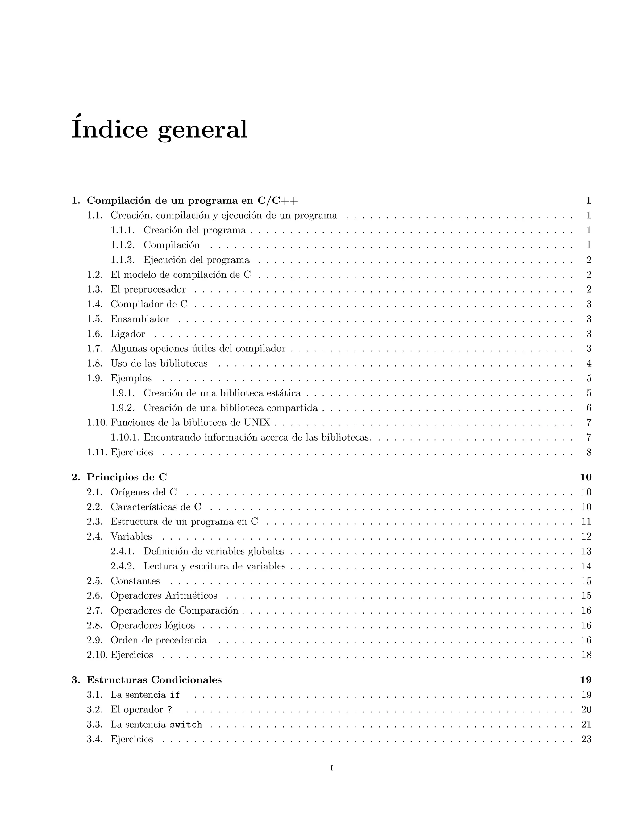Este manual cubre los conceptos básicos de C, incluyendo la compilación de programas, variables, constantes, operadores, estructuras condicionales e iterativas, funciones, tipos de datos avanzados como estructuras y uniones, apuntadores, asignación dinámica de memoria y estructuras ligadas. El manual contiene ejemplos y ejercicios para cada tema.