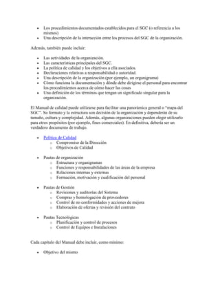El documento define el manual de calidad como un documento que especifica la misión, visión y política de calidad de una empresa, así como sus objetivos relacionados con la calidad. Explica que el manual de calidad expone la estructura del sistema de gestión de calidad de una empresa y que puede ser un documento público. Además, describe que el manual de calidad establece cómo la empresa cumple con los requisitos de normas como ISO 9001 y que incluye información sobre la gestión, el compromiso con la calidad y la gestión de recursos de una organización.