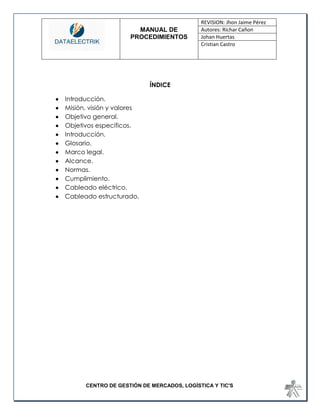 Este manual presenta los procedimientos para la instalación de redes eléctricas y de datos, incluyendo la misión, visión, valores, objetivos, glosario de términos, marco legal y normas aplicables. Explica los procesos para realizar instalaciones eléctricas y de datos, así como los materiales requeridos de acuerdo con las normas técnicas colombianas y estándares internacionales.