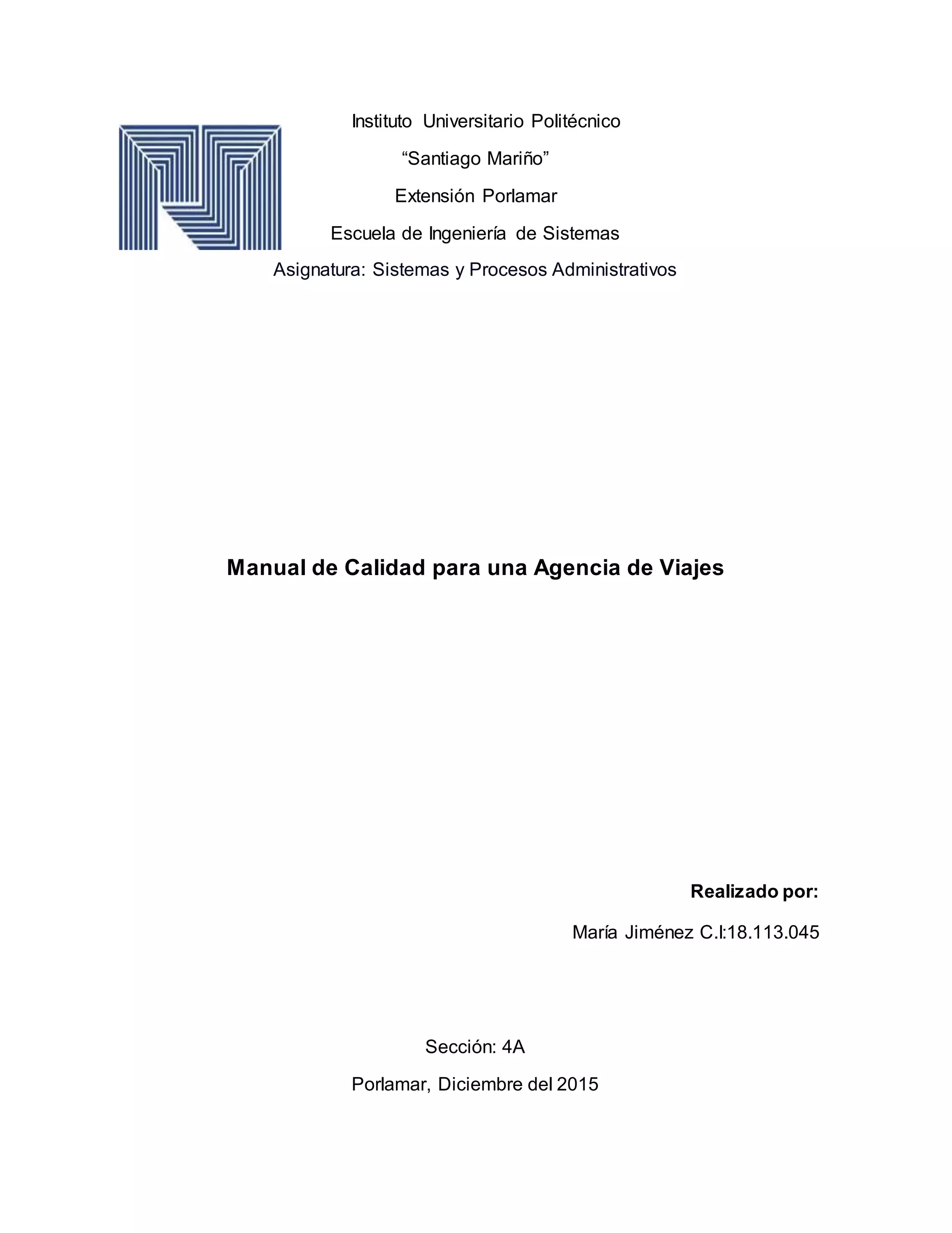 Este documento presenta un manual de calidad para una agencia de viajes. Describe la organización de la agencia, incluyendo los departamentos de gerencia, ventas/marketing, operaciones y administración. Explica las funciones y responsabilidades de cada departamento. También incluye la política de calidad de la agencia y los requisitos generales de su sistema de gestión de calidad.