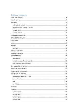 Este documento proporciona una introducción al lenguaje de programación C/C++. Explica que C es un lenguaje de programación estructurado desarrollado originalmente en 1972 y que es ampliamente utilizado para desarrollar sistemas operativos y aplicaciones. Define conceptos clave como identificadores, variables, tipos de datos, estructuras de control, funciones y entrada/salida. Además, presenta una guía de referencia sobre las características y funcionalidades principales del lenguaje C/C++.