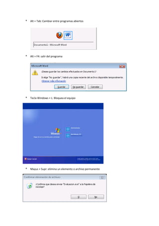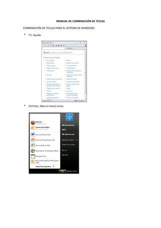 Este documento presenta combinaciones de teclas para Windows, Office y navegación en Internet. Para Windows, incluye atajos como F1 para ayuda, Ctrl+Esc para el menú inicio y Alt+Tab para cambiar entre programas. Para Office, cubre atajos como Ctrl+C para copiar, Ctrl+V para pegar y Ctrl+Z para deshacer. Para la navegación web, explica combinaciones como Ctrl+T para abrir pestañas, Ctrl+W para cerrar pestañas y F5 para actualizar páginas.