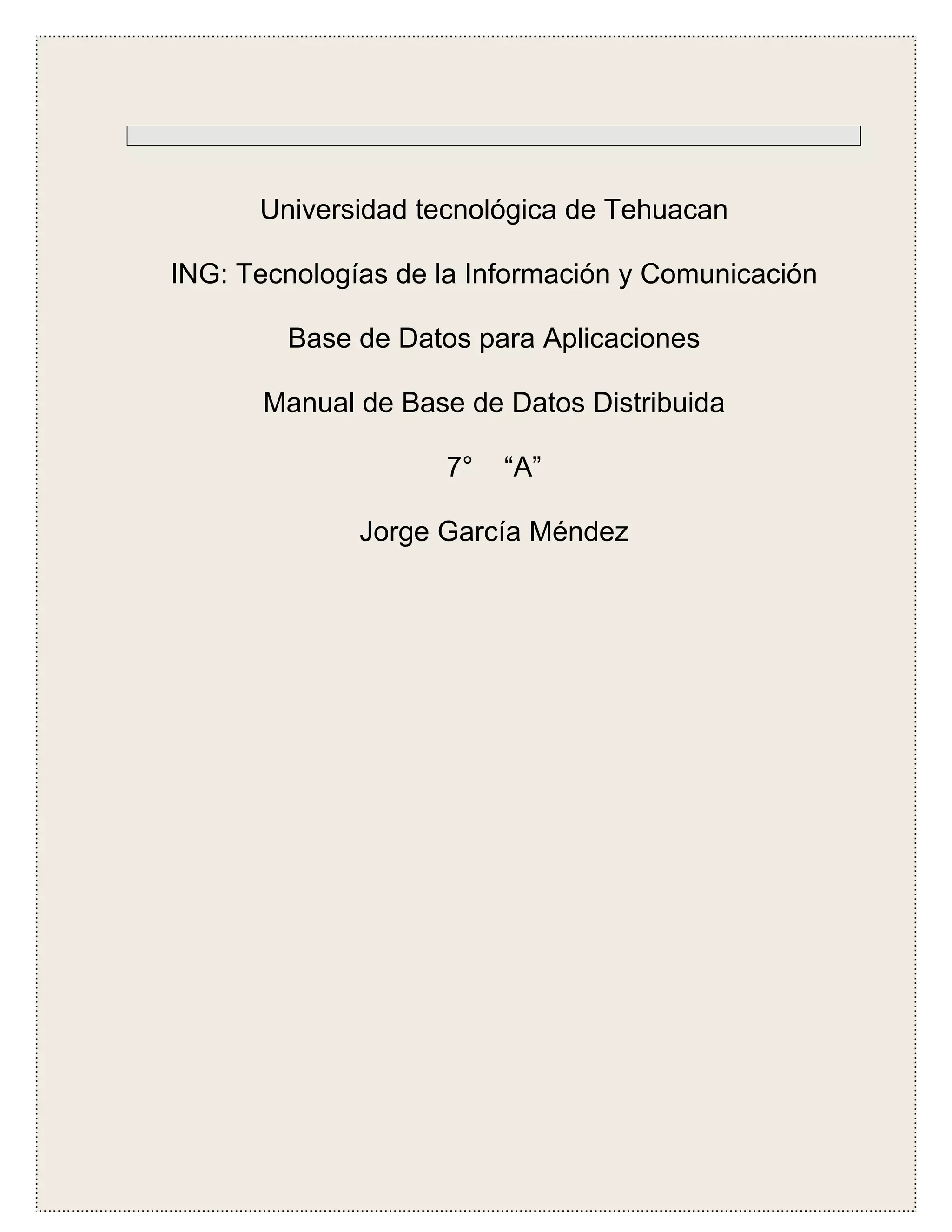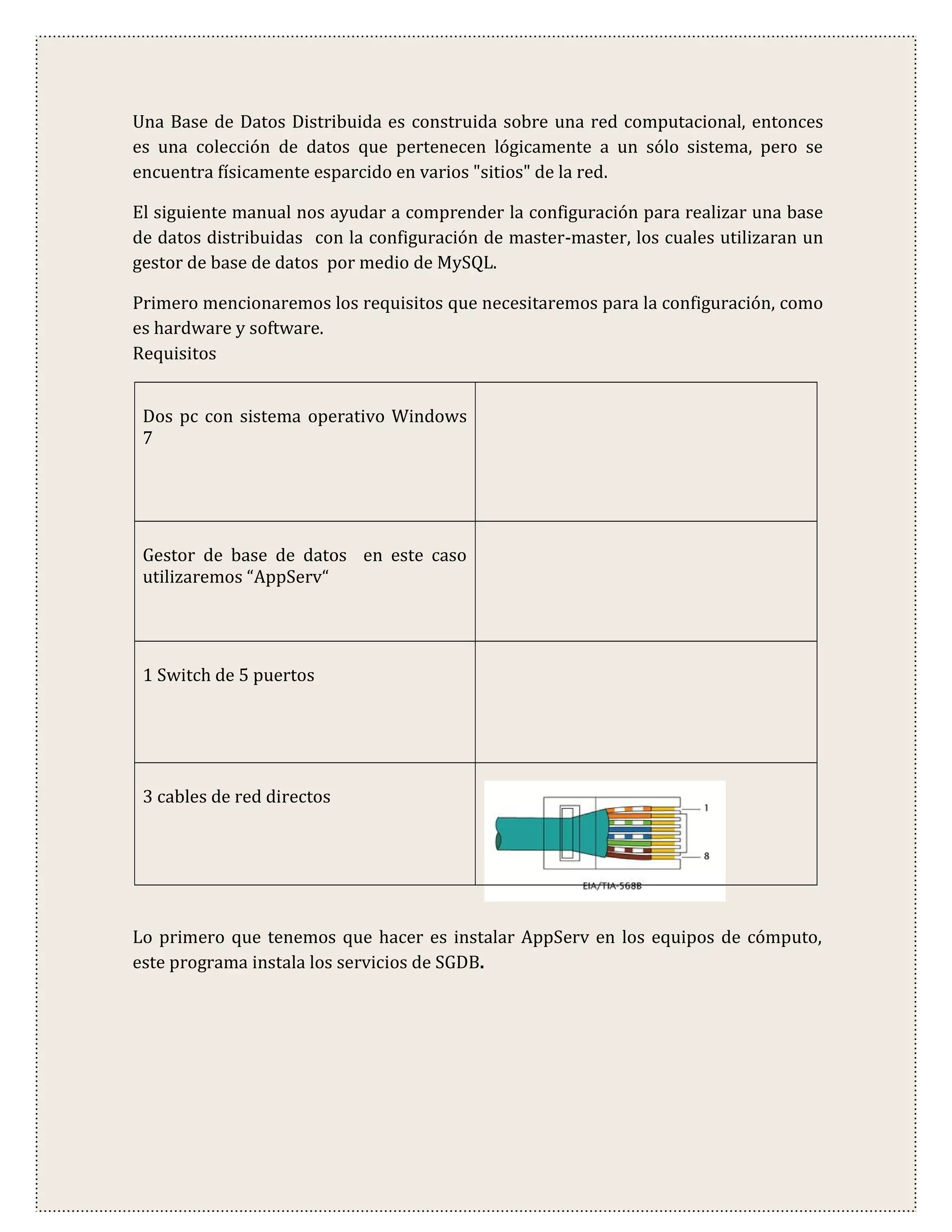 Este documento describe cómo configurar una base de datos distribuida con arquitectura maestro-maestro utilizando MySQL. Se requiere hardware como dos PCs con Windows 7 y software como AppServ. Se explica cómo configurar las IPs de las máquinas, los archivos my.ini para replicación, y crear un usuario replicación. Finalmente, se prueba modificando datos en el maestro 1 y verificando que se repliquen en el esclavo 1.