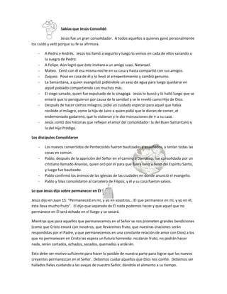 El documento habla sobre la consolidación de nuevos creyentes. Explica que la consolidación consiste en afirmar la decisión de fe de los nuevos creyentes, velar por sus necesidades, y asegurar que permanezcan en el Señor. También compara la consolidación al cuidado amoroso que una madre le brinda a un recién nacido. Finalmente, ofrece consejos sobre cómo consolidar a nuevos creyentes siguiendo el ejemplo de Jesús y los primeros cristianos.