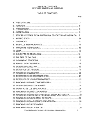 Este manual de convivencia presenta la información básica sobre la Institución Educativa La Esmeralda, incluyendo su historia, ideario, símbolos, funciones de los diferentes estamentos de la comunidad educativa, deberes, derechos, normas de convivencia, tipos de faltas y sus respectivos protocolos. El documento busca establecer las pautas para una sana convivencia entre los miembros de la comunidad educativa.