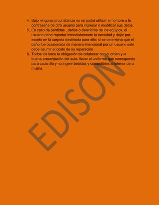 Este documento presenta las normas y lineamientos para el uso adecuado de las aulas de informática en instituciones educativas. Define cuatro tipos de usuarios permitidos y establece que está prohibido acceder a contenido inapropiado, instalar software sin autorización o utilizar los datos de otro usuario. Además, los usuarios deben reportar cualquier daño ocurrido a los equipos e incurrir en los costos de reparación si el daño fue intencional. Por último, todos deben colaborar manteniendo el orden en el aula y no