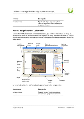Este documento describe el espacio de trabajo de CorelDRAW, incluyendo la terminología, los componentes principales de la ventana de la aplicación como las barras de menús, herramientas y propiedades, y cómo personalizar el espacio de trabajo. También explica cómo acceder a comandos a través de la caja de herramientas, barras de herramientas, ventanas acoplables y barra de propiedades.