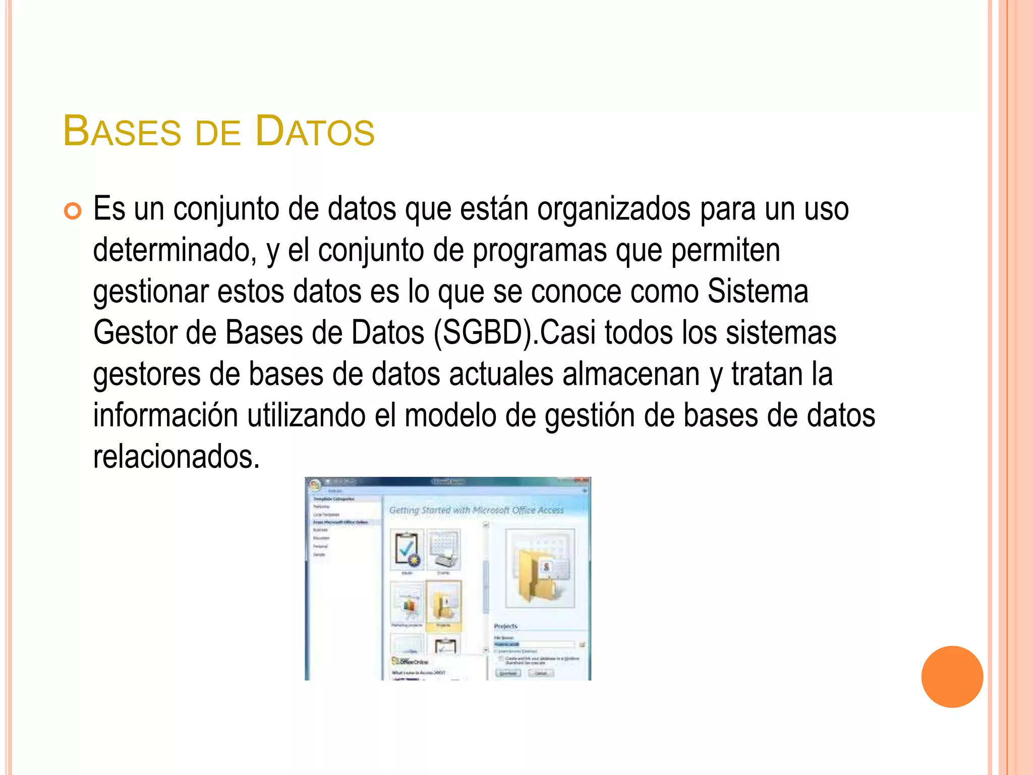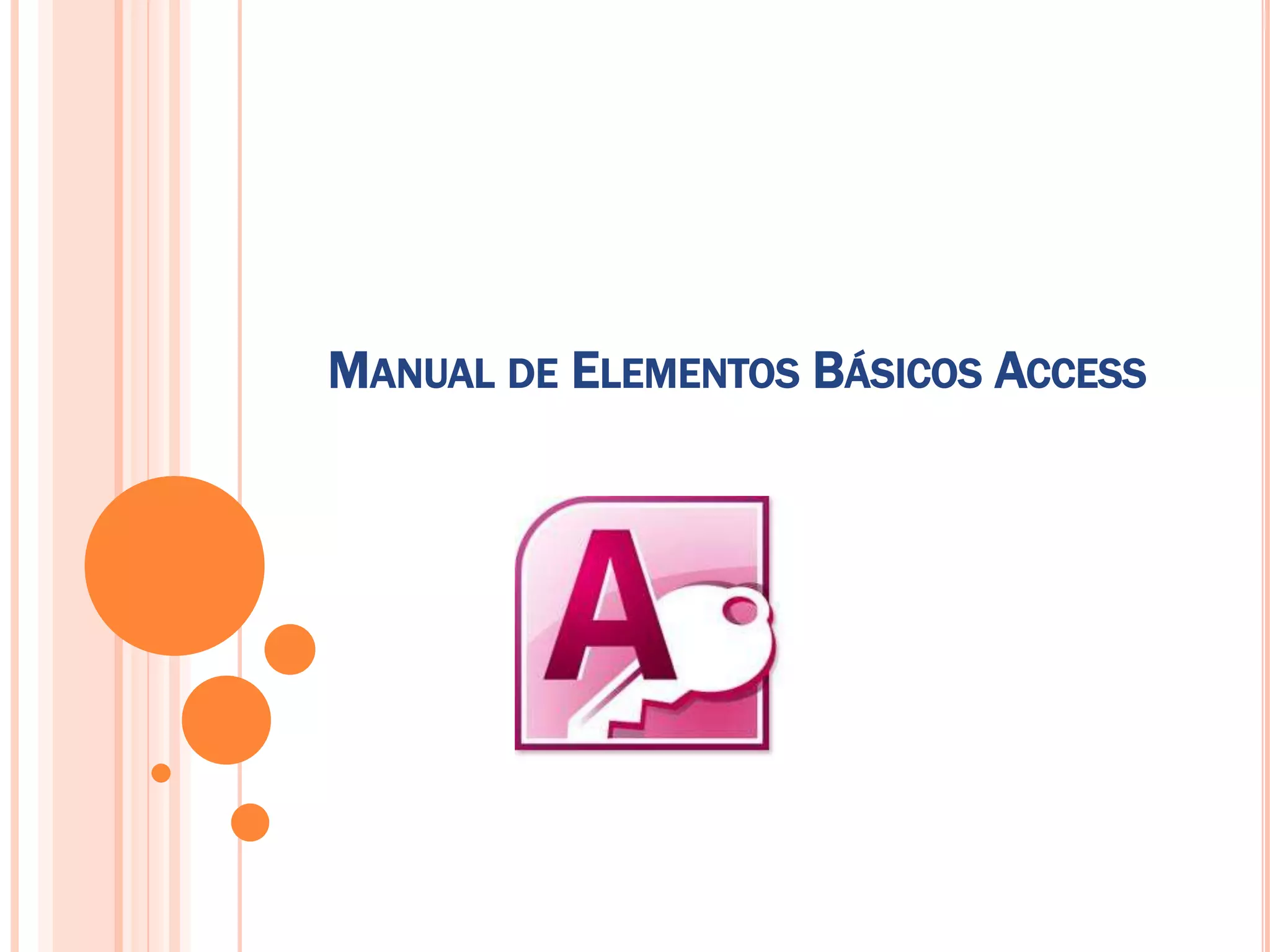 Este documento resume los elementos básicos de Access, incluyendo tablas de datos que almacenan información sobre un tema particular mediante campos y registros, consultas que permiten extraer datos de las tablas según ciertas condiciones, formularios para la introducción y visualización de datos de las tablas, e informes para presentar los datos de forma impresa. También describe macros para definir acciones en respuesta a eventos, módulos para codificar procedimientos personalizados, y llaves para buscar registros y crear relaciones entre tablas de forma