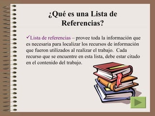 Este documento presenta las pautas de estilo APA para citar y crear una lista de referencias. Explica qué es una lista de referencias, los tipos de citas (directas e indirectas), y cómo crear citas de diferentes fuentes como libros, capítulos de libros, publicaciones periódicas, documentos de Internet y bases de datos. Provee numerosos ejemplos para cada tipo de fuente.