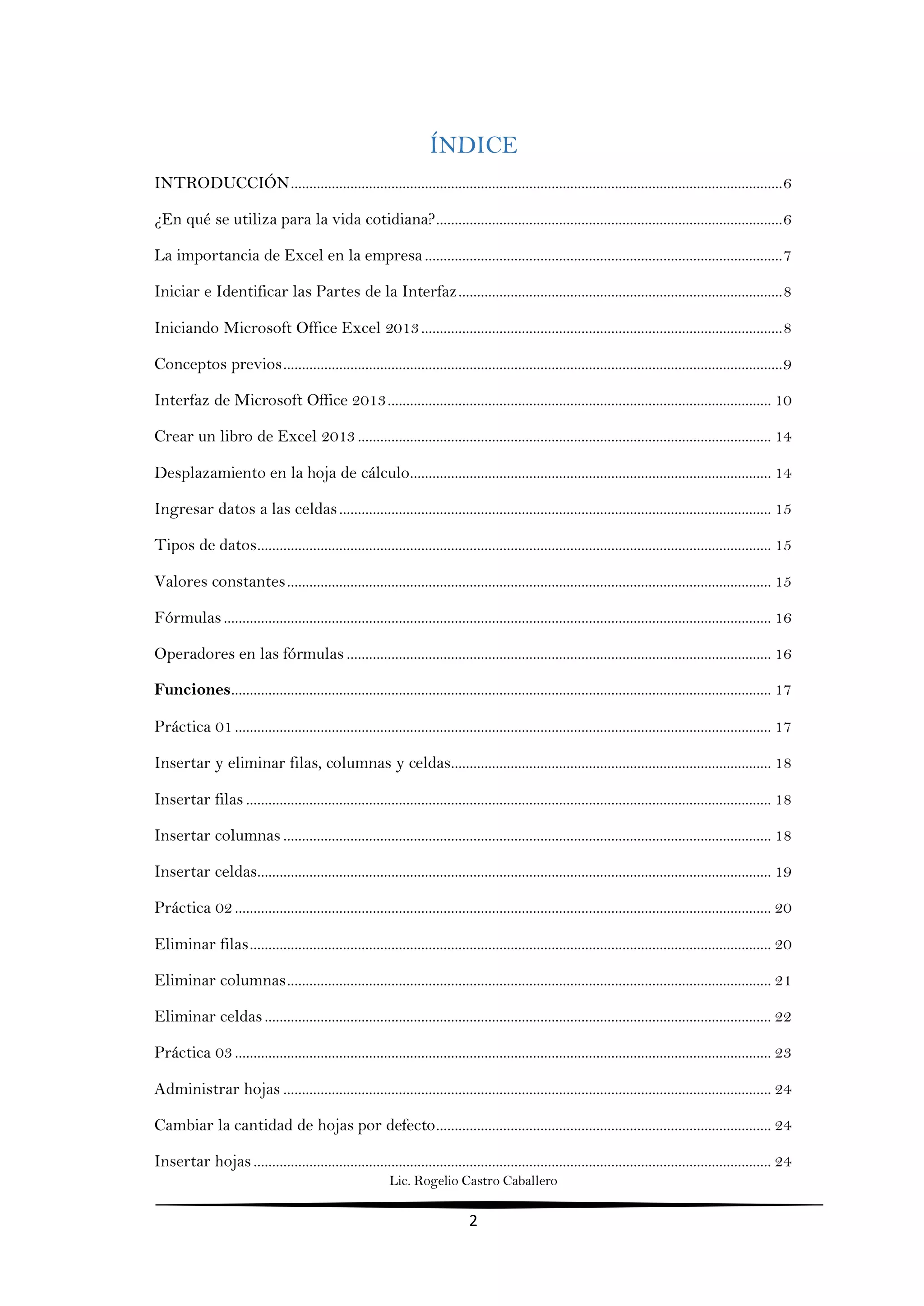 El documento es un manual sobre Microsoft Excel 2013 que explica su importancia en la vida cotidiana y en negocios, describiendo sus funcionalidades y la interfaz de usuario. Incluye guías prácticas para realizar diversas operaciones, como crear libros, ingresar datos y utilizar fórmulas y funciones. Además, se destaca la relevancia de Excel en la automatización de tareas y la toma de decisiones en entornos profesionales.