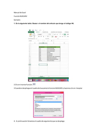 Este documento describe algunas funciones básicas de Microsoft Excel como PROMEDIO, SI y BUSCARV. La función PROMEDIO calcula el promedio de un grupo de datos. La función SI evalúa una condición y devuelve un valor u otro dependiendo de si es verdadera o falsa. La función BUSCARV busca un valor en una columna y devuelve el valor de la misma fila en otra columna especificada.