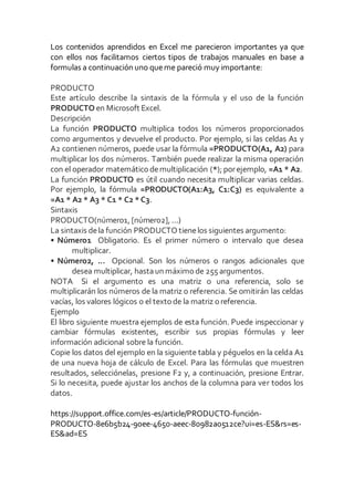 La función PRODUCTO en Excel multiplica todos los números proporcionados como argumentos y devuelve el producto. Por ejemplo, la fórmula =PRODUCTO(A1:A3,C1:C3) multiplica los números en las celdas A1 a A3 y C1 a C3. La función PRODUCTO es útil para multiplicar varias celdas en una sola fórmula en lugar de usar múltiples operadores de multiplicación.