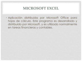 Excel es una aplicación de hojas de cálculo desarrollada por Microsoft que se utiliza comúnmente para tareas financieras y contables. Permite realizar cálculos a través de funciones que operan sobre valores de celdas, como sumas, promedios, máximos y mínimos. También incluye fórmulas para sumar según criterios determinados y contar celdas que cumplen condiciones específicas.