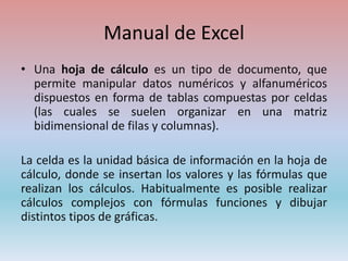 El documento proporciona una breve introducción sobre hojas de cálculo, indicando que permiten manipular datos numéricos y alfanuméricos en celdas organizadas en filas y columnas. Luego resume las funciones BUSCARH, BUSCARV, MIN, CONCATENAR, PROMEDIO, SUMA, BUSCAR, SI y MAX en Excel, destacando que encontró interesantes las funciones de SI, Suma, Min, Max y Concatenar por su facilidad de comprensión.