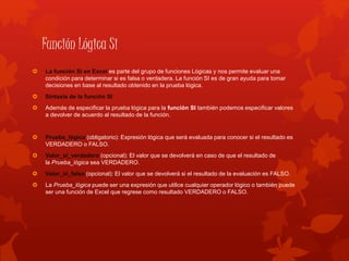 Este documento explica cómo usar las funciones LÓGICA SI y BUSCARV en Excel. La función SI evalúa una condición lógica y devuelve un valor dependiendo del resultado. La función BUSCARV busca valores en una columna pero no admite múltiples criterios; sin embargo, se puede concatenar celdas para crear una columna auxiliar que permita buscar valores combinando dos o más criterios.