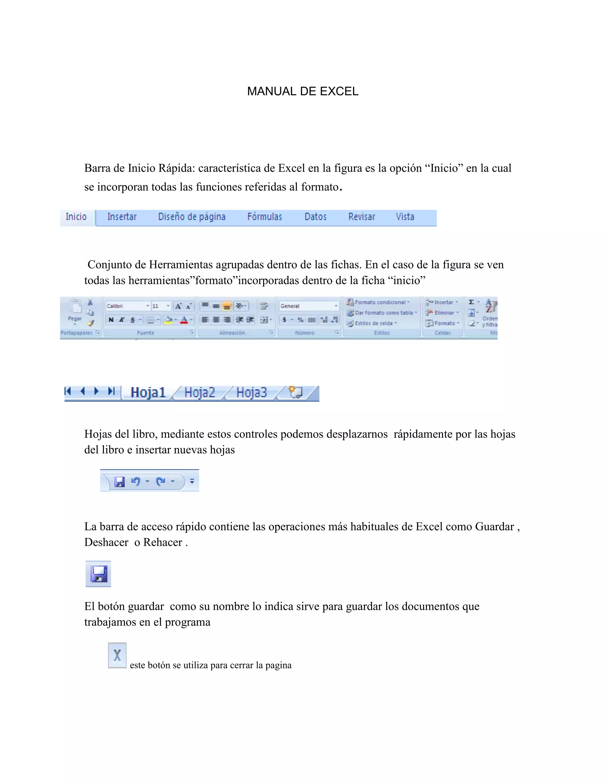 Este documento resume las características principales de la barra de inicio rápida y la barra de acceso rápido en Excel. La barra de inicio rápida incluye todas las herramientas de formato agrupadas en una sola ficha. También permite desplazarse fácilmente entre las hojas del libro. La barra de acceso rápido contiene operaciones comunes como guardar, deshacer, rehacer y cerrar documentos. Excel también proporciona asistentes para facilitar el uso de funciones.