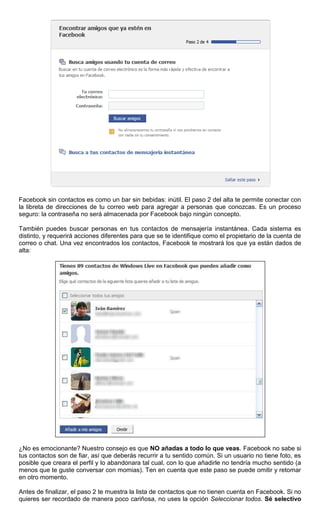Este documento proporciona una guía para los primeros pasos de usar Facebook. Explica cómo crear una cuenta, agregar contactos, completar tu perfil con información personal y fotos, y cómo comenzar a interactuar publicando actualizaciones de estado y comentando las publicaciones de tus amigos. El objetivo es ayudar a los nuevos usuarios a familiarizarse con las funciones básicas de Facebook y comenzar a participar en la red social.