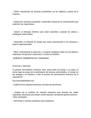 El Gerente General supervisa todas las operaciones y funciones de la empresa, representa a la empresa ante los accionistas y externamente, y establece las políticas y estrategias generales. El Gerente Administrativo Financiero administra los procesos administrativos y financieros, y elabora informes para la gerencia. El Gerente de Operaciones planifica los proyectos de riego, asigna el personal, y supervisa la ejecución y entrega de los proyectos a los clientes.
